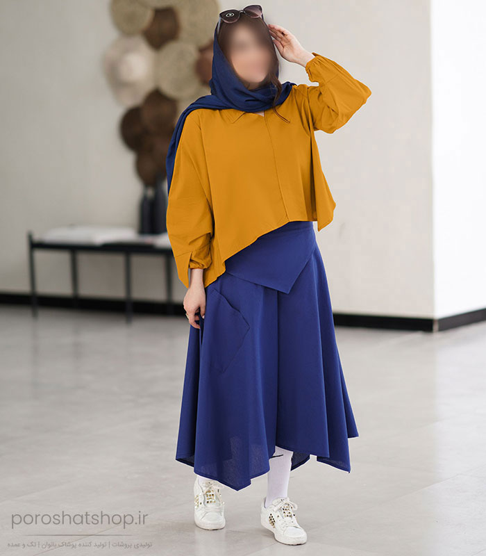 - زرد خردلی-آبی درباری: شومیز زرد خردلی با دامن آبی عمیق، جذابیت گرم با شال آبی.