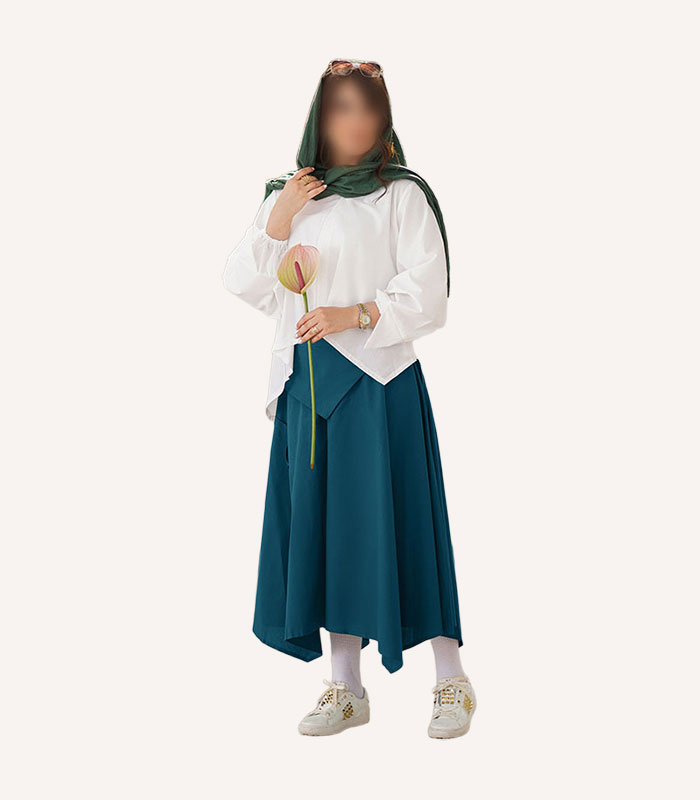 دامن شلواری پروشات با برشهای مثلثی روی شومیز و چینهای دامن، ظاهری تازه و جذاب میسازد که با ترندهای مد روز همراستا است. یقه ساده و آستینهای پهن، حرکت راحت را تضمین میکند و استایل را از کژوال به نیمهرسمی ارتقا میدهد.