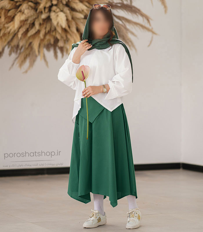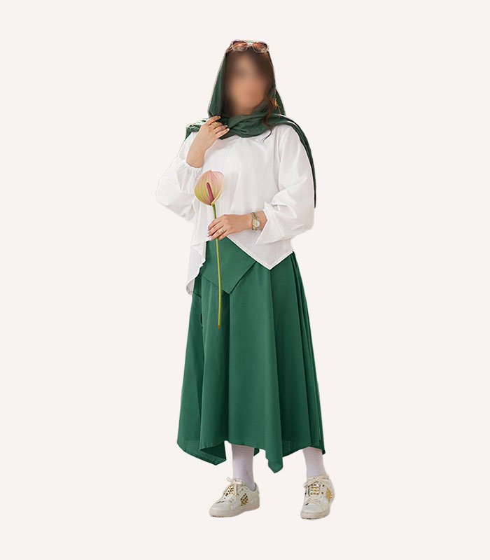 - سفید-سبز زمردی: شومیز سفید با دامن سبز زمردی تیره، حس طبیعی با شال سبز و گل صورتی.