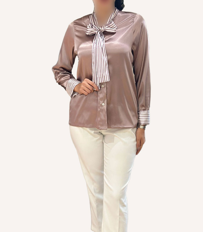 - صورتی کالباسی: شومیز ساتن صورتی ملایم با یقه پاپیون سفید راهراه و آستینهای راهدار، حس تازه.